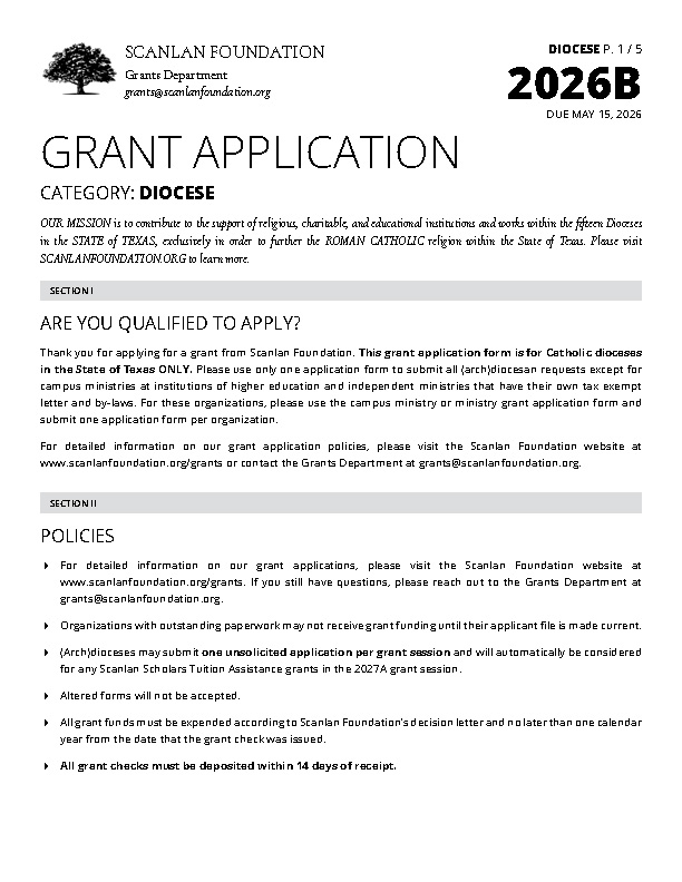 High schools in the Archdiocese of Galveston-Houston should use the High School Grant Application Form. Scanlan Foundation no longer accepts applications from high schools in other (arch)dioceses and instead makes Scanlan Scholars Tuition Assistance grants directly to these (arch)dioceses.