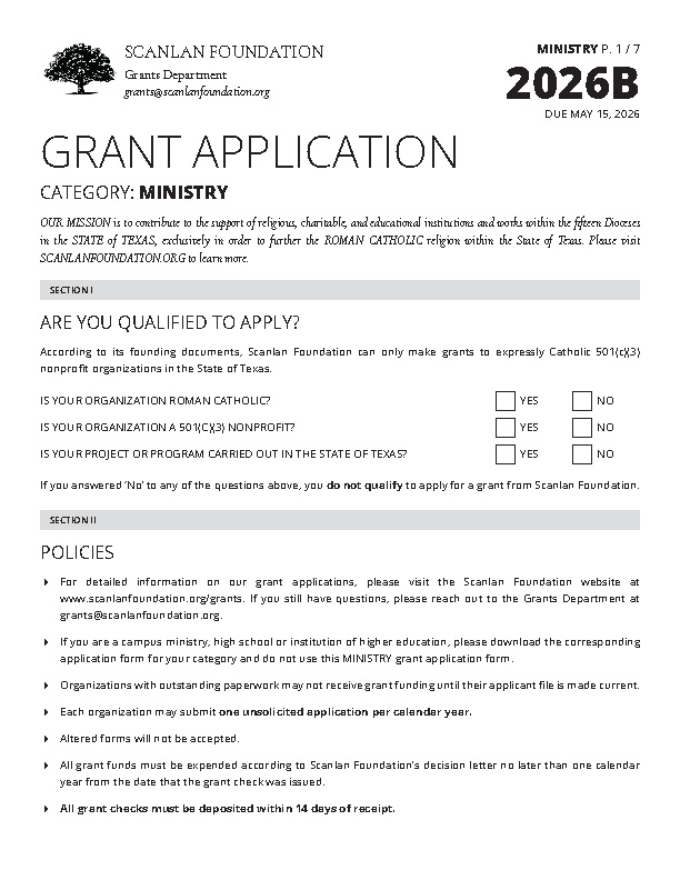 Is your organization Roman Catholic? Is your organization a 501(c)(3) nonprofit? Is your organization in the State of Texas? If you answered ‘yes’ to all three of these questions, you may apply for a grant from Scanlan Foundation.